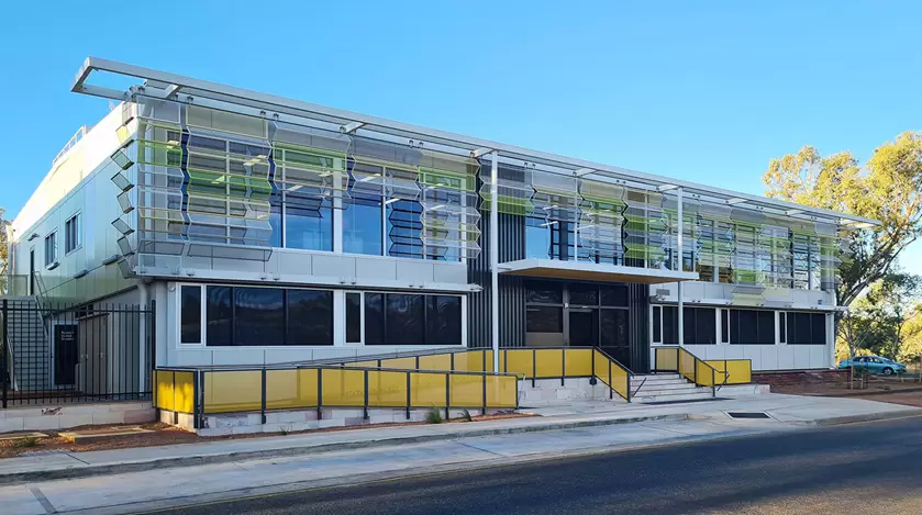 Located in Alice Springs, the new office for the MacDonnell Range Council demonstrates creative adaptive reuse of existing building structures to deliver a contemporary commercial facility. Ladded in simple robust materials, the clever use suspended steel sunscreens and colours inspired by the vegetation along the adjacent river corridor provides visual articulation and softens the external fabric. Internally, the design prioritises access to natural light for gathering areas. The central circulation spine is generous, and the integration of vibrant artwork injects colour and connects the two levels.